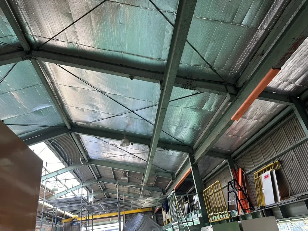 施工内容は「サーモバリアS」の天井施工であり、天井裏に遮熱シートを設置しました。遮熱シートは、熱の侵入が課題となっていた屋根の採光部にも、追加で施工を行いました。施工後、夏季に2時間おきの温度測定を実施した結果、平均で5℃の温度低下を確認できたそうです。