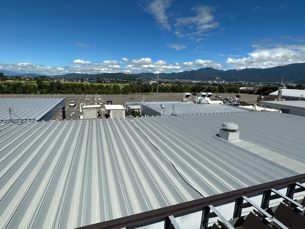 工場の折板屋根には、弊社で施工が可能な「スカイ工法」の導入がおすすめです。スカイ工法とは、輻射熱の反射性能に優れたスカイシートを屋根に直接貼り付ける工法のことです。節電対策として太陽光パネルを設置する場合には、事前にスカイ工法を導入しておくことで、スムーズな施工が可能です。